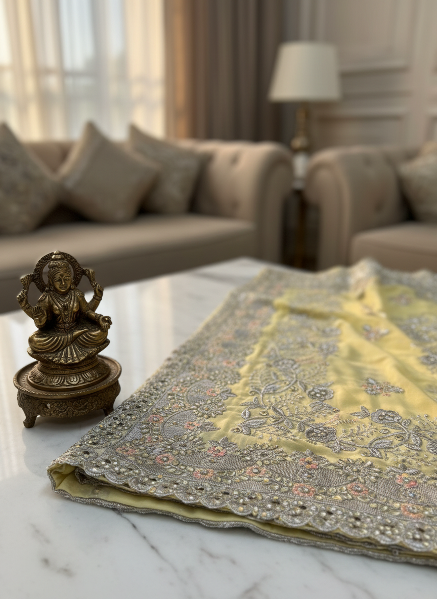light yellow chiffon saree with silver zari work